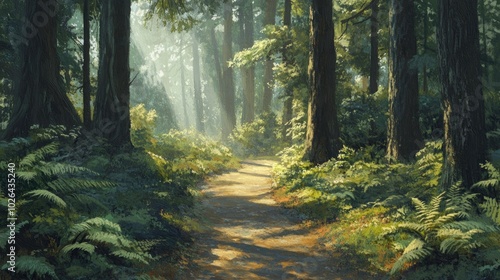 © Theeranan, Obraz premium A forest path dappled with sunlight filtering through the trees, surrounded by green ferns and tall trunks.