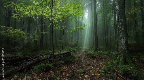 Fototapeta premium A forest path illuminated by a bright light filtering through the foliage...