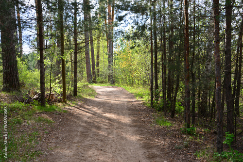 Fototapeta premium A forest path illuminated by sunlight with tall pine trees no people