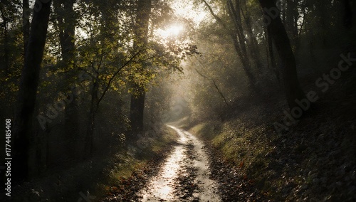 © YiXiong, Obraz premium A forest path in sunlight, showcasing nature's tranquility, growth, and scenic beauty.