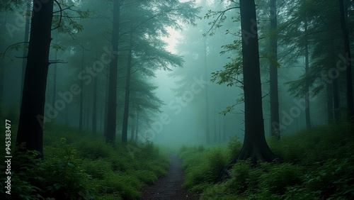 © Passion, Obraz premium A forest path is shown in the rain, with trees on either side