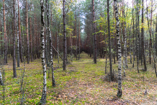 Fototapeta premium A forest path leading through a pine-birch forest in Poland.