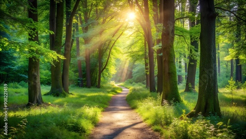 © boxcs, Obraz premium A Forest Path Leading Through a Sunlit Glade AI generated