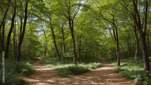 Fototapeta premium A forest path lined with trees and foliage during spring or summer