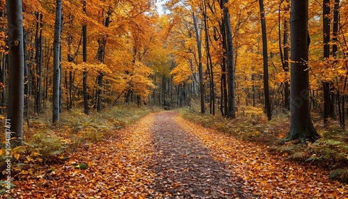 © Deamard, Obraz premium A forest path surrounded by golden fall leaves.
