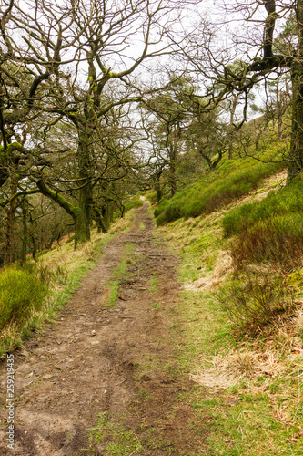 © Dolwolfian, Obraz premium A forest path trail with trees and green vegetation under a white cloudy sky