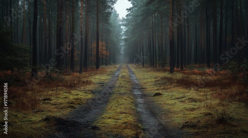 © ZeeZaa, Naklejka premium A forest path with a road in the middle