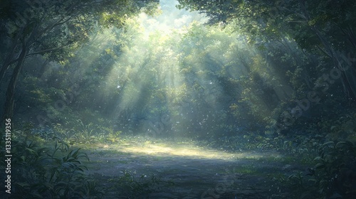 © Серг Нечаев, Obraz premium A forest path with sunlight filtering through the trees.