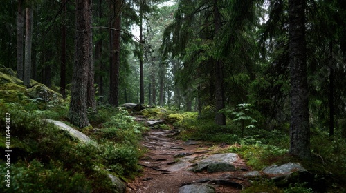 Fototapeta premium A forest path with trees and rocks. The path is wet and muddy