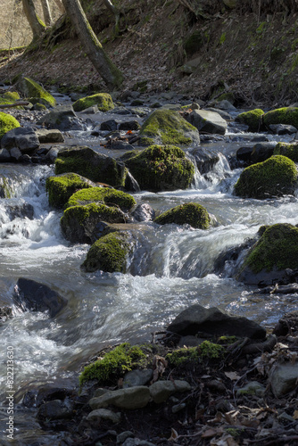 © Peter, Fototapeta premium a forest stream flows between moss-covered stones