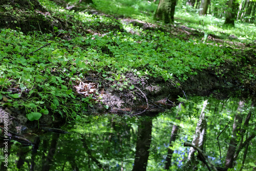 Fototapeta premium A forest stream with a mirror-like reflection of dense trees and green...
