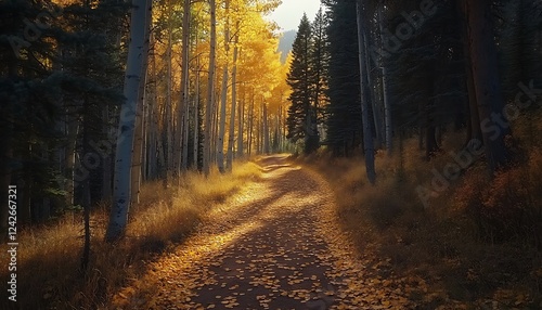 © Hameed, Obraz premium A forest trail covered in golden autumn leaves and surrounded by tall trees with sunlight streaming through