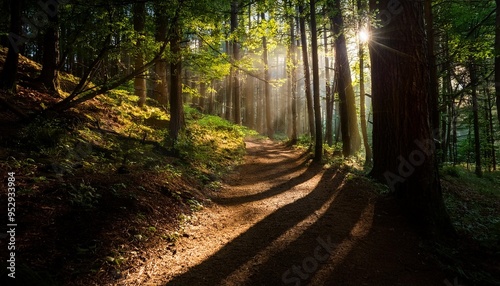 Fototapeta premium a forest trail illuminated by sunlight filtering through tree branches...