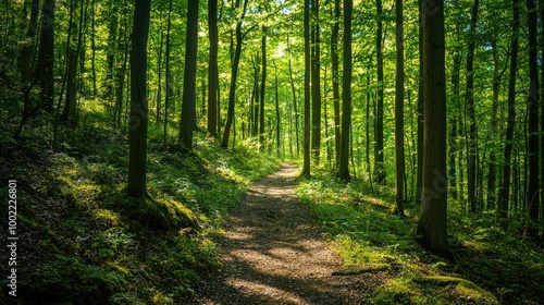 Obraz premium A forest trail with dappled sunlight filtering through the trees, inviting...