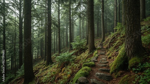 Obraz premium A forest trail with trees and moss-covered ground in a lush green woodland...