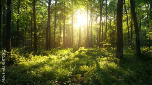 Obraz premium A forest with a bright sun shining through the trees