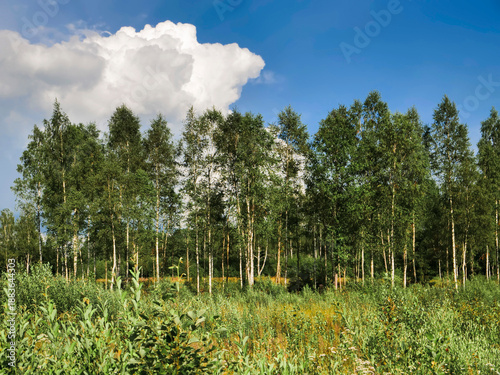 Obraz premium A forest with a fine birch trees in the foreground. Relaxing nature...