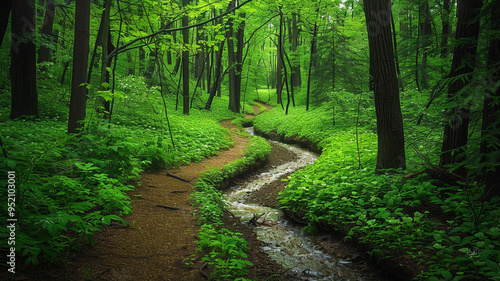 © Muhammad, Obraz premium a forest with a gentle brook winding its way through a lush, green landscape