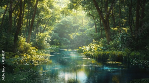 Obraz premium A forest with a river running through it