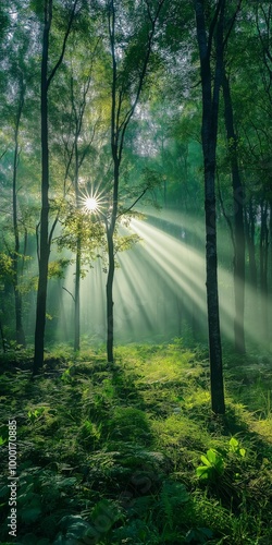 © Andrii Zastrozhnov, Obraz premium A forest with a sun shining through the trees. The sun is casting a warm glow on the forest floor