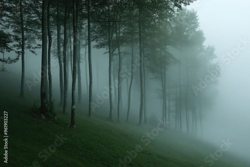© Synthetica, Obraz premium A forest with foggy trees and a hill in the background