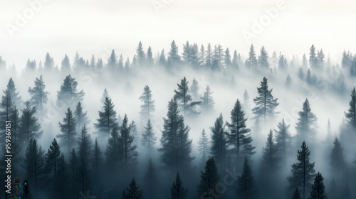 Obraz premium A forest with foggy trees and a misty sky. The trees are tall and dense, creating a sense of depth and mystery. The fog adds a sense of calm and serenity to the scene