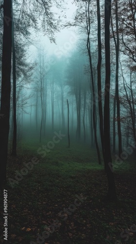 Fototapeta premium A forest with foggy trees and a path