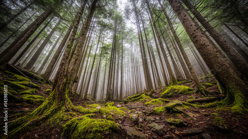 © LarisaM, Obraz premium A forest with moss growing on the ground and trees. The moss is green and the trees are tall