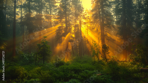 Obraz premium A forest with sun rays shining through the trees.