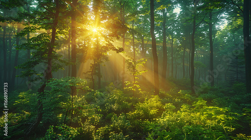 © IYIKON, Naklejka premium A forest with sunlight shining through the trees