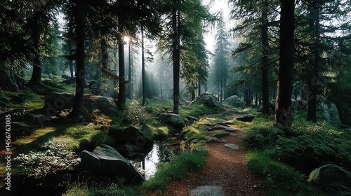 © Clint, Fototapeta premium a forest with sunlight shining through the trees