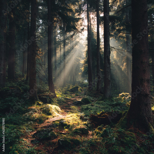 © Thai, Obraz premium A forest with sunlight shining through the trees