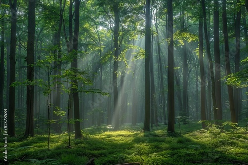 © VISUAL BACKGROUND, Obraz premium A forest with sunlight shining through the trees.