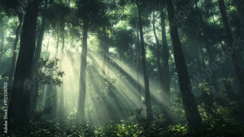 © CYBERPINK, Fototapeta premium A forest with sunlight shining through the trees