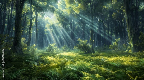 Obraz premium A forest with sunlight shining through the trees. The light is bright and...