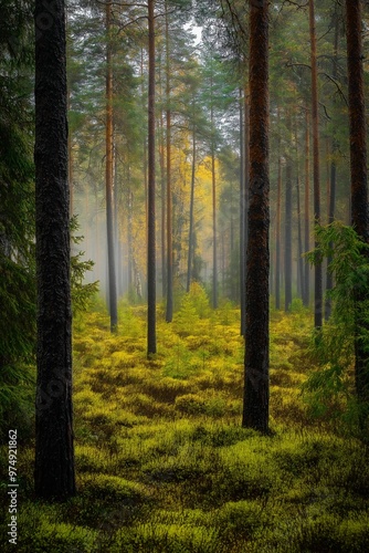 © Andrii Zastrozhnov, Naklejka premium A forest with trees and a lot of green grass. The sky is cloudy and the sun is not visible