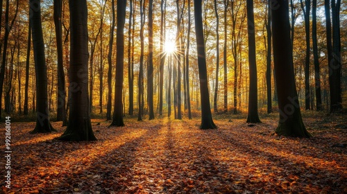 © ZeeZaa, Obraz premium A forest with trees and leaves on the ground