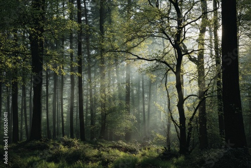 © tope007, Obraz premium A forest with trees and sunlight shining through the leaves