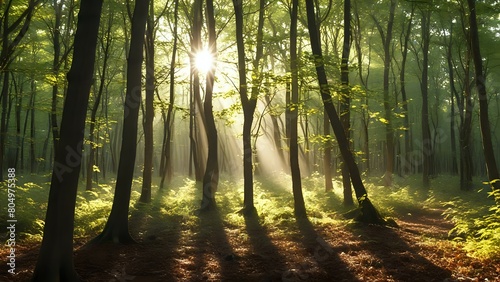 © Wanida, Obraz premium A forest with trees and sunlight shining through the leaves