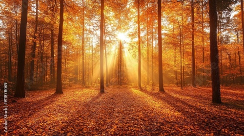 Fototapeta premium A forest with trees in the foreground and background. The sun is shining...