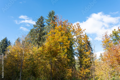 © jr-art, Naklejka premium A forest with trees in various stages of autumn