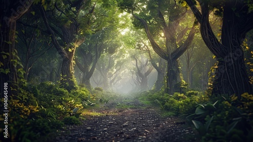 © umar, Naklejka premium A forest with trees that glow with an internal light, illuminating the path ahead