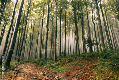 © Tomasz, Fototapeta premium A fork in the forest hiking trails in the foggy, morning forest.