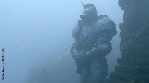 © Jojo*, Fototapeta premium A formidable figure in antique armor stands watch in a misty landscape.