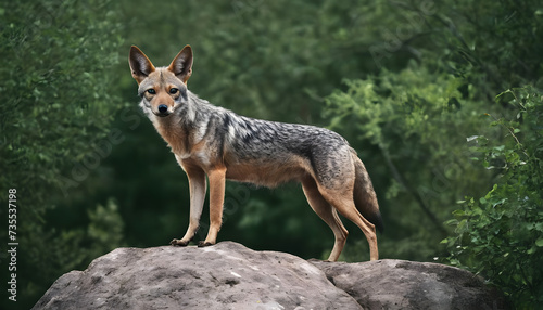 Obraz premium A formidable Jackal standing on a rock surrounded by trees and vegetation. Splendid nature concept.