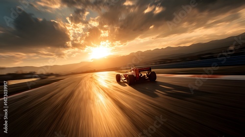 © JoaoNalio, Obraz premium A formula one race car speeding around a circuit track during a vibrant, golden sunset.