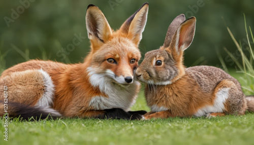 © paulmalaianu, Fototapeta premium A fox and a rabbit are sitting together. Animal friendship concept.