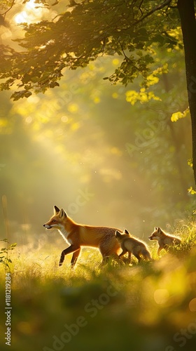 © Iswanto, Fototapeta premium A fox and its cubs walk through a sunlit forest, highlighting nature's beauty.