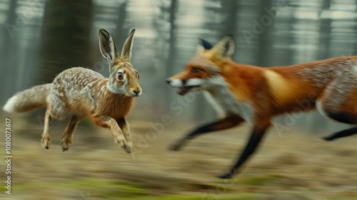 Fototapeta premium A fox chasing a hare through a blurred forest background