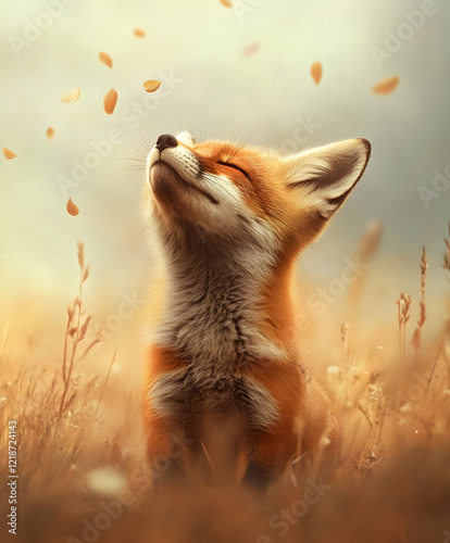 © Zape, Obraz premium A fox cub sneezing while sitting in a meadow, with flowers scattering in the air.
